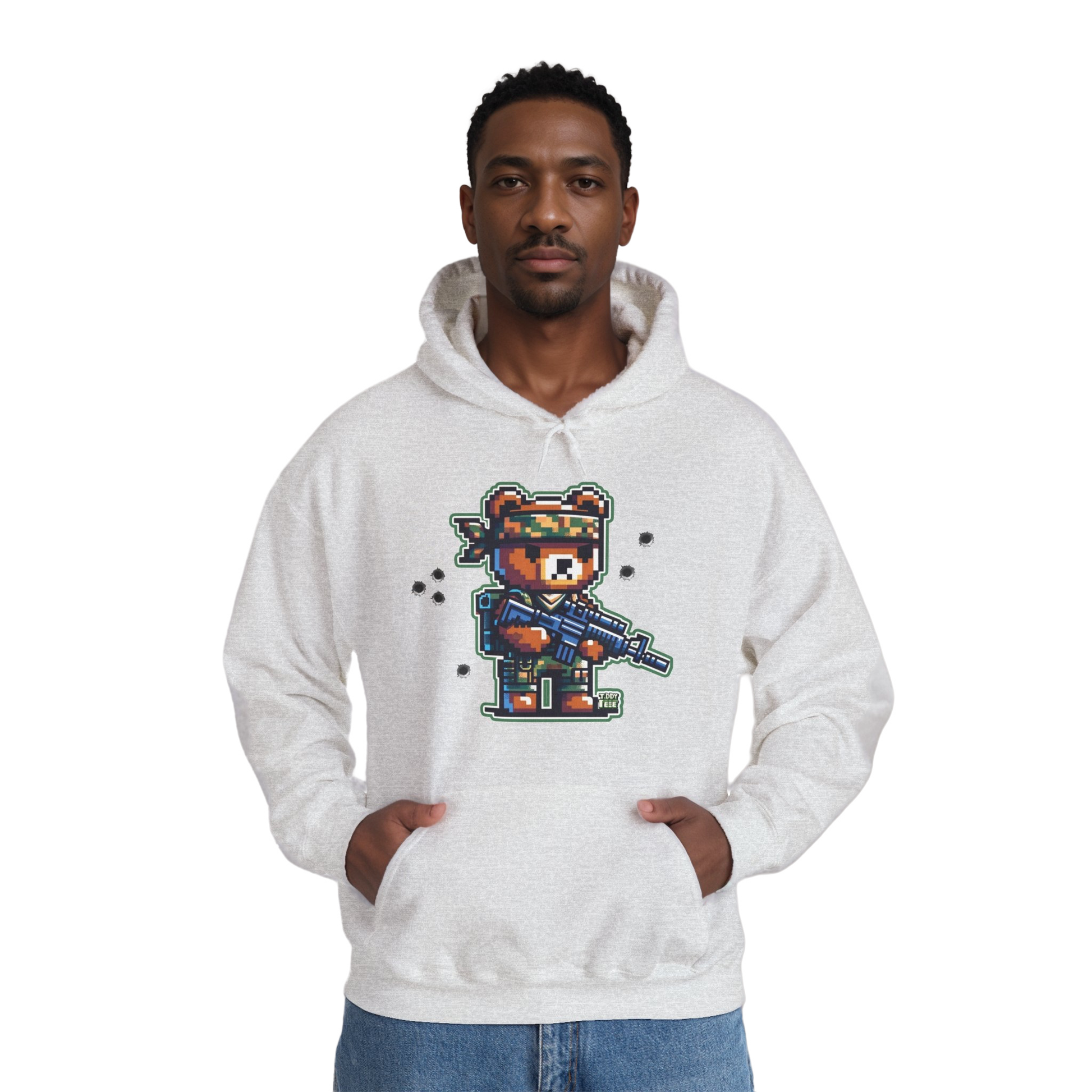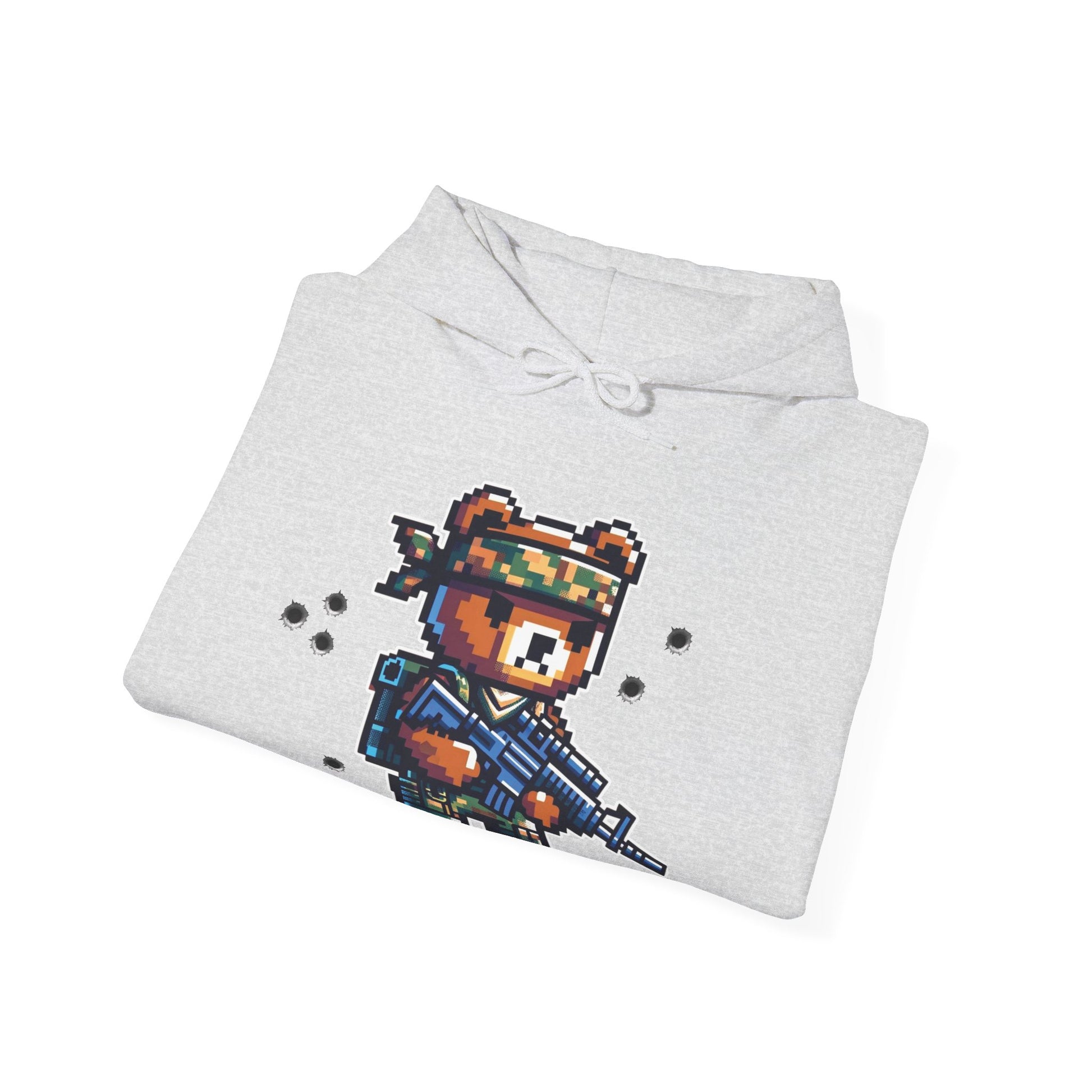 Embrace playful style with our unisex 8-bit Soldier Bear Pullover Hoodie made with 50% cotton and 50% polyester for that cozy feel and warmth you need in a hoodie. Available in various sizes and colors, it features a fierce teddy bear soldier with a retro 8-bit style . Perfect for casual wear!