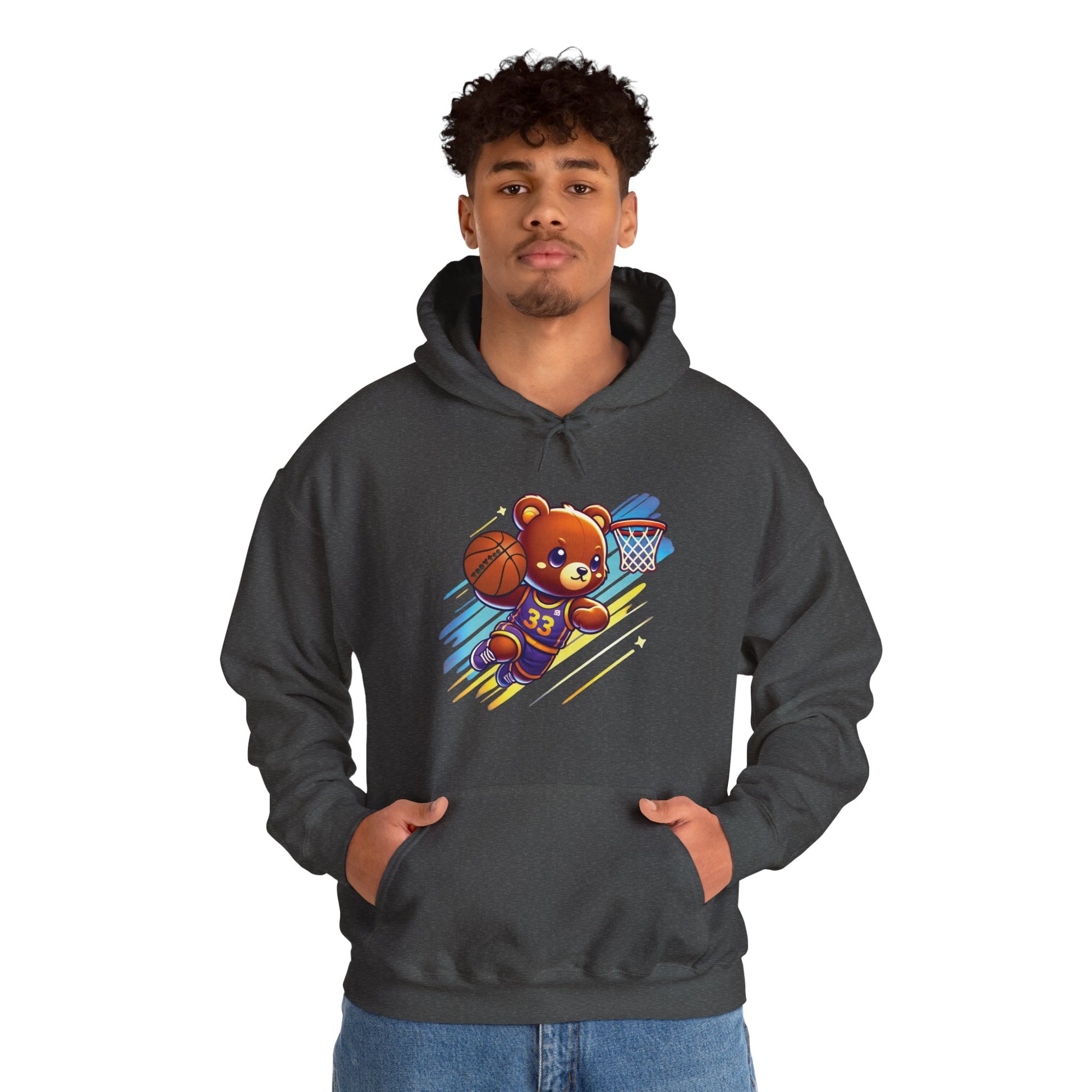 - Design: Features an action-packed cartoon bear mid-dunk in a vibrant basketball uniform, with a bold, colorful background and hoop design.