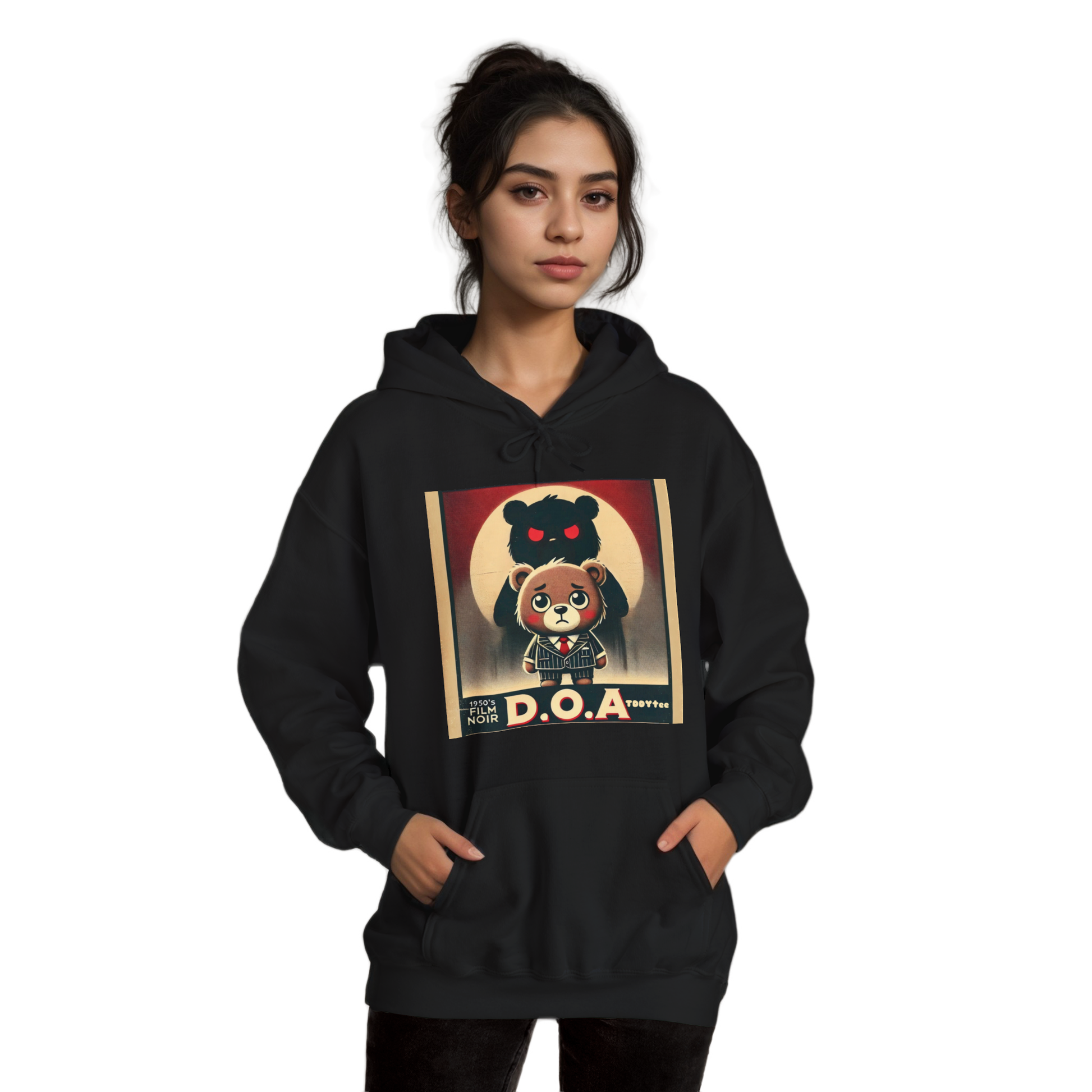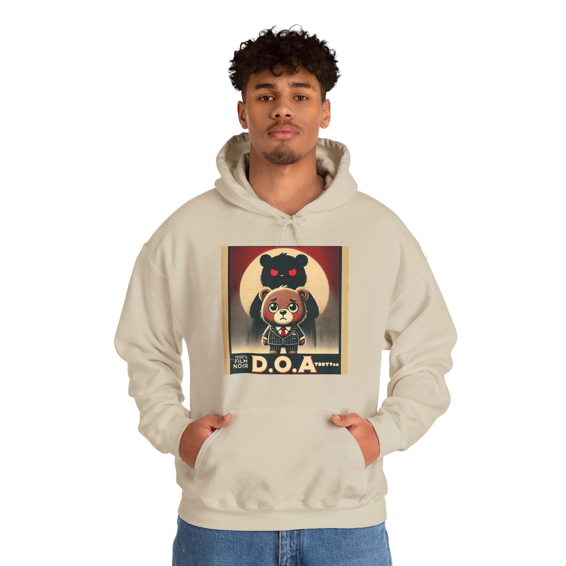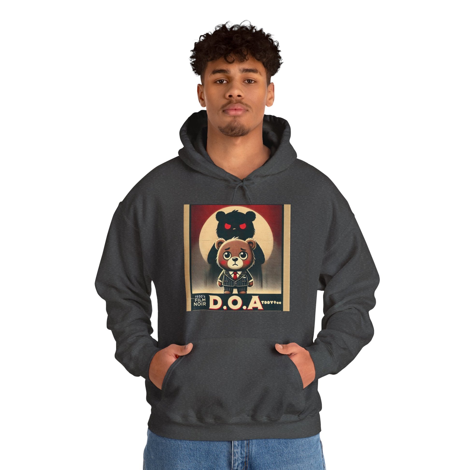 - Design: Inspired by the classic 1950s film noir Dead On Arrival (D.O.A.), this hoodie features a somber cartoon bear in a vintage pinstripe suit, overshadowed by a mysterious, menacing figure. A tribute to cinematic history, the design captures the suspense and intrigue of the era.