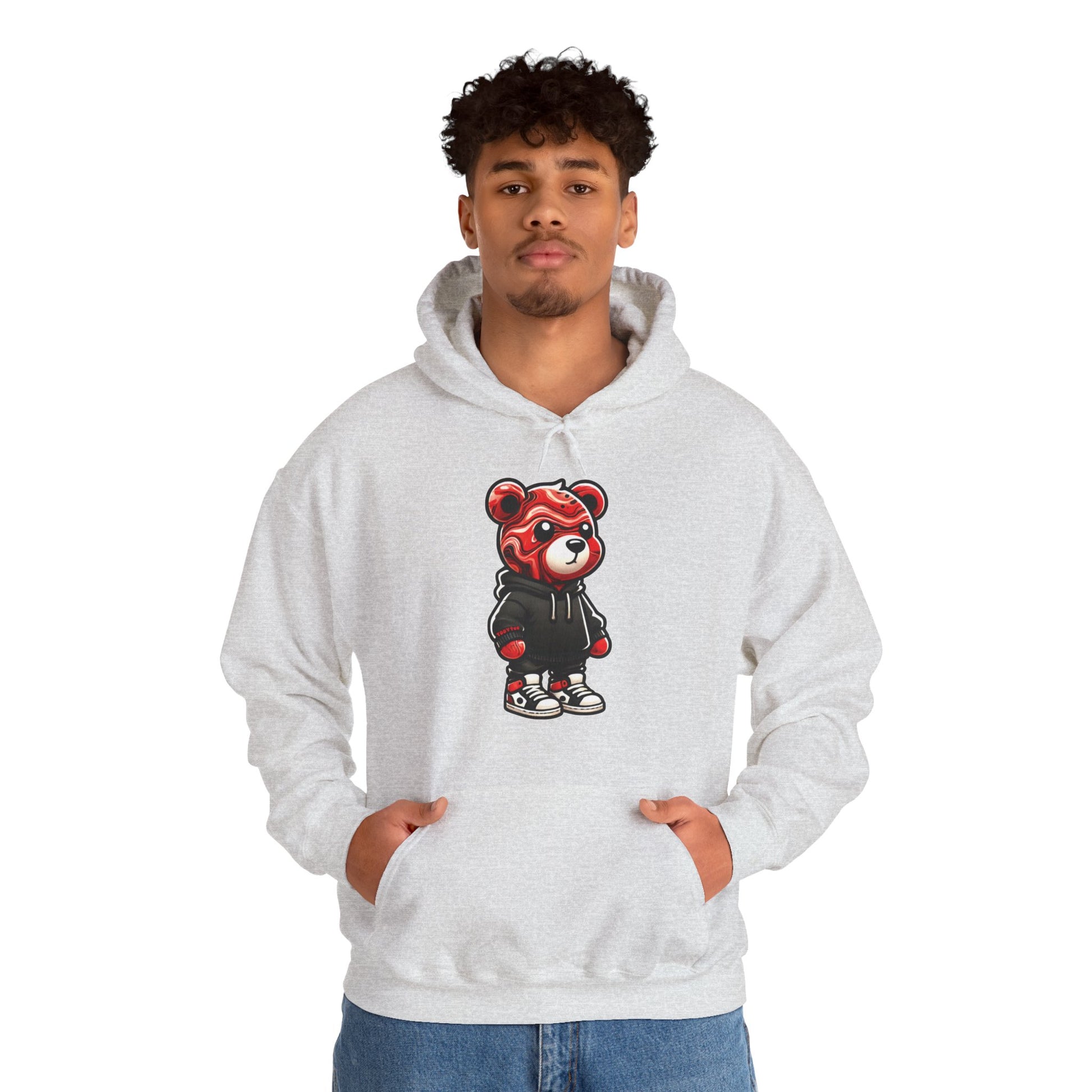 Limited Edition Red Marble teddy bear hoodie. Made with a thick blend of cotton and polyester, this unisex graphic hoodie feels plush, soft and warm, a perfect choice for any cold day.