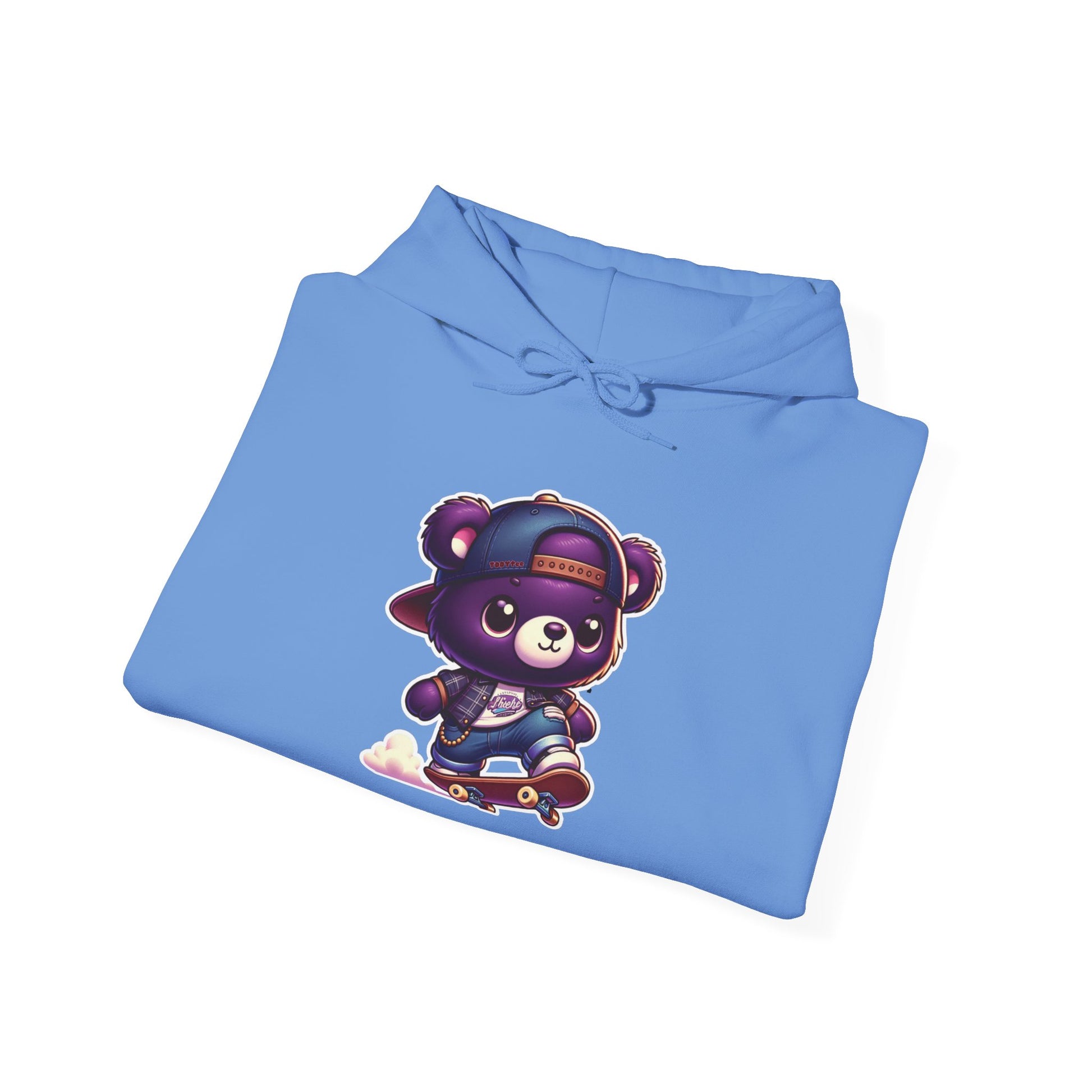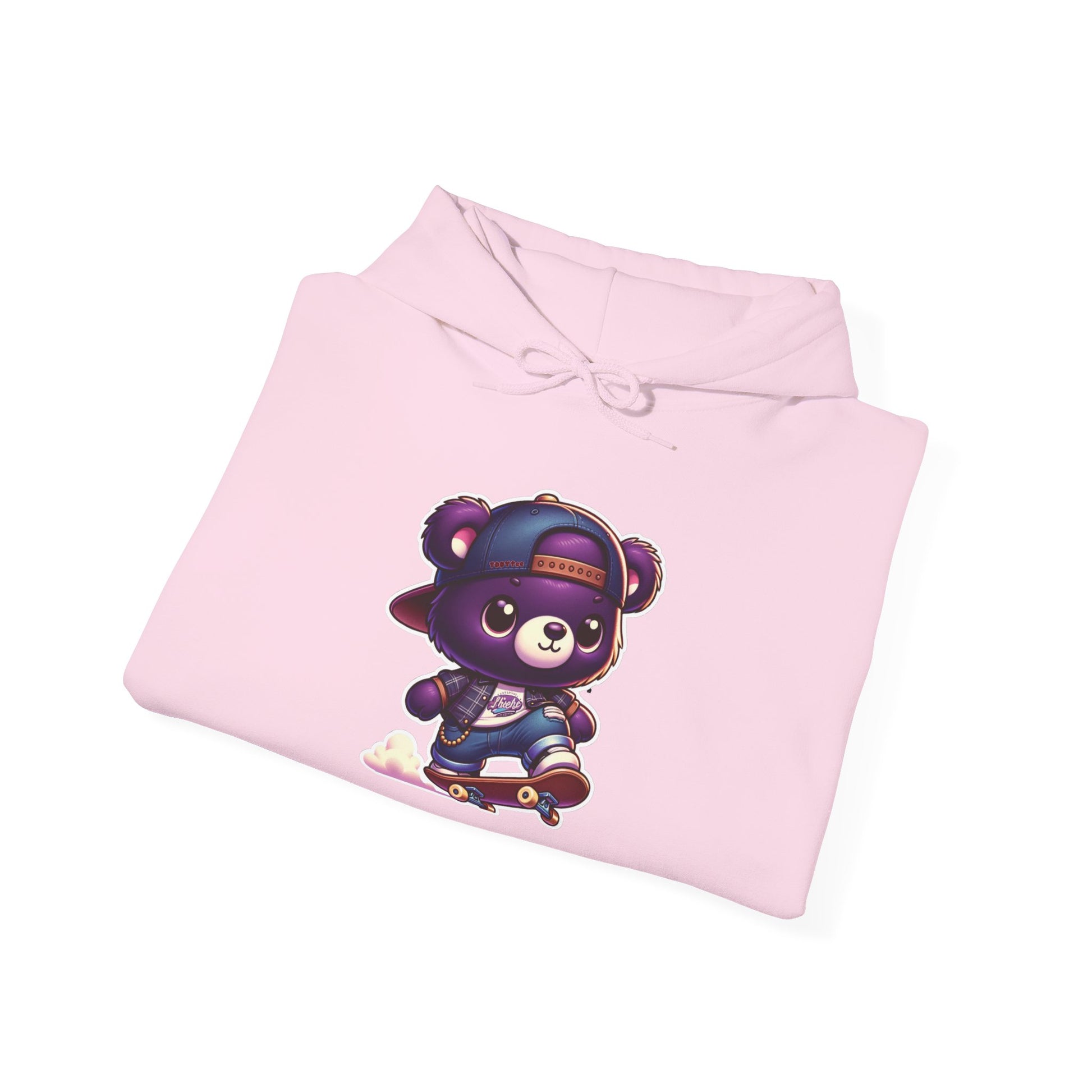 Embrace playful style with our unisex Skater Bear Pullover Hoodie made with 50% cotton and 50% polyester for that cozy feel and warmth you need in a hoodie. Available in various sizes and colors, it features a purple teddy bear shredding in style. Perfect for casual wear!
